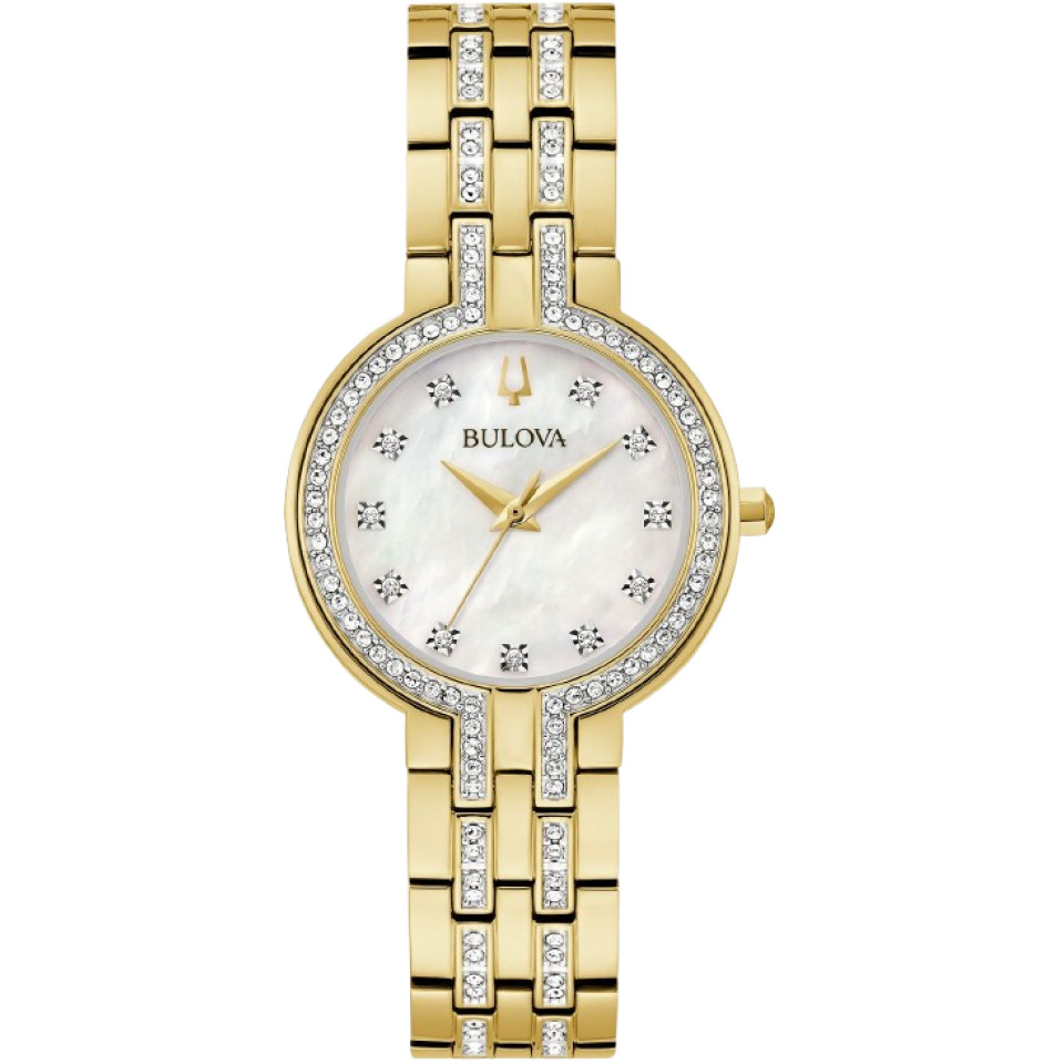 Thiết kế táo bạo, cao cấp là đặc điểm của chiếc đồng hồ nữ Classic Bulova Prestige này, cân bằng giữa thiết kế táo bạo với vẻ ngoài thanh lịch. Đồng hồ có vỏ thép không gỉ tông vàng 32mm nhiều mặt với vành bezel hình học, mặt kính sapphire phẳng có lớp phủ chống phản quang, khả năng chống nước 100m và dây đeo 3 mắt vát cạnh với lớp hoàn thiện được chải và đánh bóng cùng khóa cài dạng bấm. Mặt số xà cừ sáng bóng có kim đồng hồ tông vàng và các vạch chỉ giờ được phủ lớp phát quang Super-LumiNova cùng màn hình hiển thị ngày. Nổi bật với cả vẻ hiện đại và sự tinh tế, chiếc đồng hồ nữ Bulova này là người bạn đồng hành lý tưởng trên mọi cổ tay. Bộ máy 2115.technology Quartz Bộ máy chạy bằng pin. Tinh thể thạch anh điều chỉnh thời gian đạt độ chính xác 15 giây một tháng. Chiều rộng vỏ (mm) 32. Chiều rộng càng (mm) 18. Trọng lượng (g) 96. Mặt số màu trắng. Điểm nhấn màu vàng Kim phát sáng; Kim phát sáng. Kiểu dây đeo: Vòng đeo tay. Chất liệu vỏ bằng thép không gỉ. Thép không gỉ tông vàng. Chốt khóa có nút bấm. Pha lê: Tinh thể Sapphire chống phản chiếu. Chống va đập và vỡ – lớp phủ chống phản chiếu làm lệch hướng ánh sáng. Chống nước 100M. Chức năng bổ sung: 3 kim, Ngày