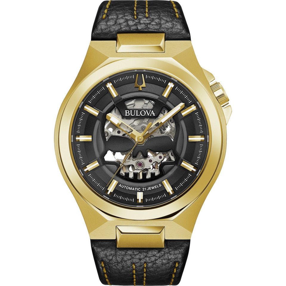 Mặt số màu xanh với các chỉ số chấm và vạch tông màu bạc, ba kim, cửa sổ ngày và logo Bulova