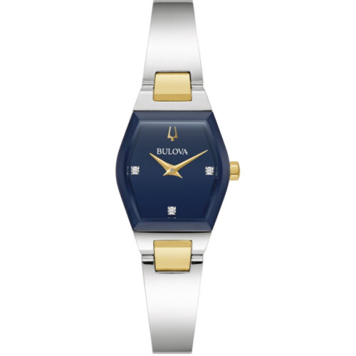 Chiếc đồng hồ nữ đặc biệt này thuộc Bộ sưu tập Bulova Gemini, sở hữu thiết kế hiện đại và tinh tế, mang đến một tuyên ngôn thời gian. Vỏ đồng hồ tông bạc và vàng nổi bật với tinh thể khoáng kim loại mài cạnh sắc sảo màu xanh lam, tạo nên chiều sâu phong phú, phản chiếu trên mặt số xanh thẳm. Nổi bật với điểm nhấn tông vàng cùng kim đồng hồ vát cạnh và ba viên kim cương 0,8mm đính trên mặt số, chiếc đồng hồ kết hợp hoàn hảo với dây đeo tay kiểu vòng tay bạc và vàng, có khóa cài kim loại. Một thiết kế đương đại tinh tế đến kinh ngạc, chiếc đồng hồ nữ Bulova này sẽ nâng tầm bất kỳ bộ trang phục nào. Công nghệ GL24: Quartz. Bộ máy hoạt động bằng pin. Tinh thể thạch anh điều chỉnh thời gian đạt độ chính xác 15 giây một tháng. Chiều rộng vỏ (mm) 22,5. Chiều rộng vấu (mm) 12,3. Trọng lượng (g) 46. Mặt số: Kim cương xanh, Kim cương; Âm thoa. Loại dây đeo: Thép không gỉ. Chất liệu vỏ: Thép không gỉ hai tông màu. Khóa: Khóa trang sức. Pha lê: Tinh thể khoáng kim loại hóa nhiều mặt. Chống nước 30M. Chức năng bổ sung: 2 kim