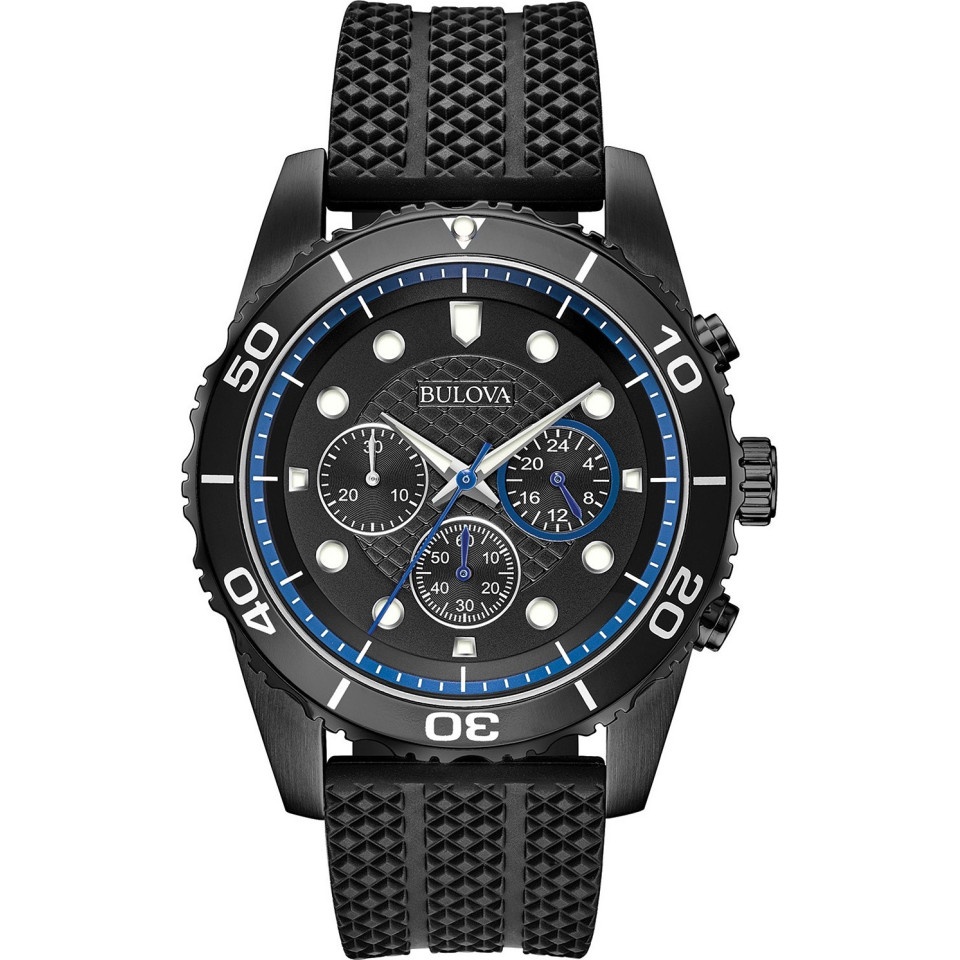 Vỏ và vòng đeo tay bằng thép không gỉ cân bằng tốt tạo nên mặt số đồng hồ bấm giờ màu xanh cổ điển cho chiếc đồng hồ Thể thao quý giá của Bulova.