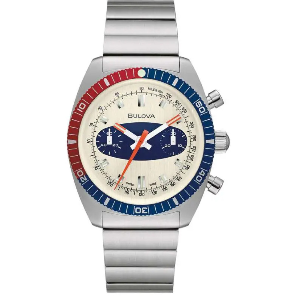 Vỏ thép không gỉ hình tonneau bất đối xứng đặc biệt với mặt kính kim loại cong Futuro đặc trưng màu xanh lam, mặt số màu xanh lam và dây đeo bằng thép không gỉ. Đồng hồ có bộ máy thạch anh ba kim, khóa triển khai có nút đẩy và khả năng chống nước ở độ sâu 30 mét.