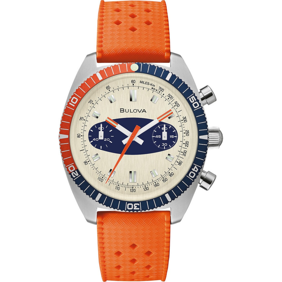 Một thấu kính pha lê hình vòm che phủ mặt số đồng hồ bấm giờ đồ họa của chiếc đồng hồ thể thao màu xanh nổi bật này từ bộ sưu tập Archive Surfboard mang tính biểu tượng của Bulova.