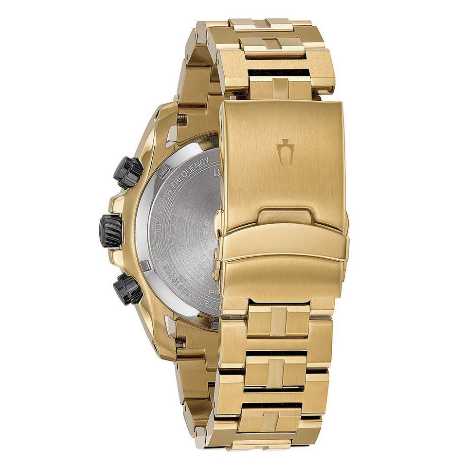 From the Precisionist Collection with precise timing to 1/1000th of a second and continuous-sweep second hand, the Precisionist Chronograph is particularly refined. In stainless steel with gold-tone and grey finish and black dial, flat mineral glass, screw-back case, screw-down crown, and double-press fold-over buckle and safety clasp. Powered by Bulova’s unique three-prong quartz crystal Precisionist movement with a 262 kHz vibrational frequency—eight times greater than standard watches—it defines accuracy.