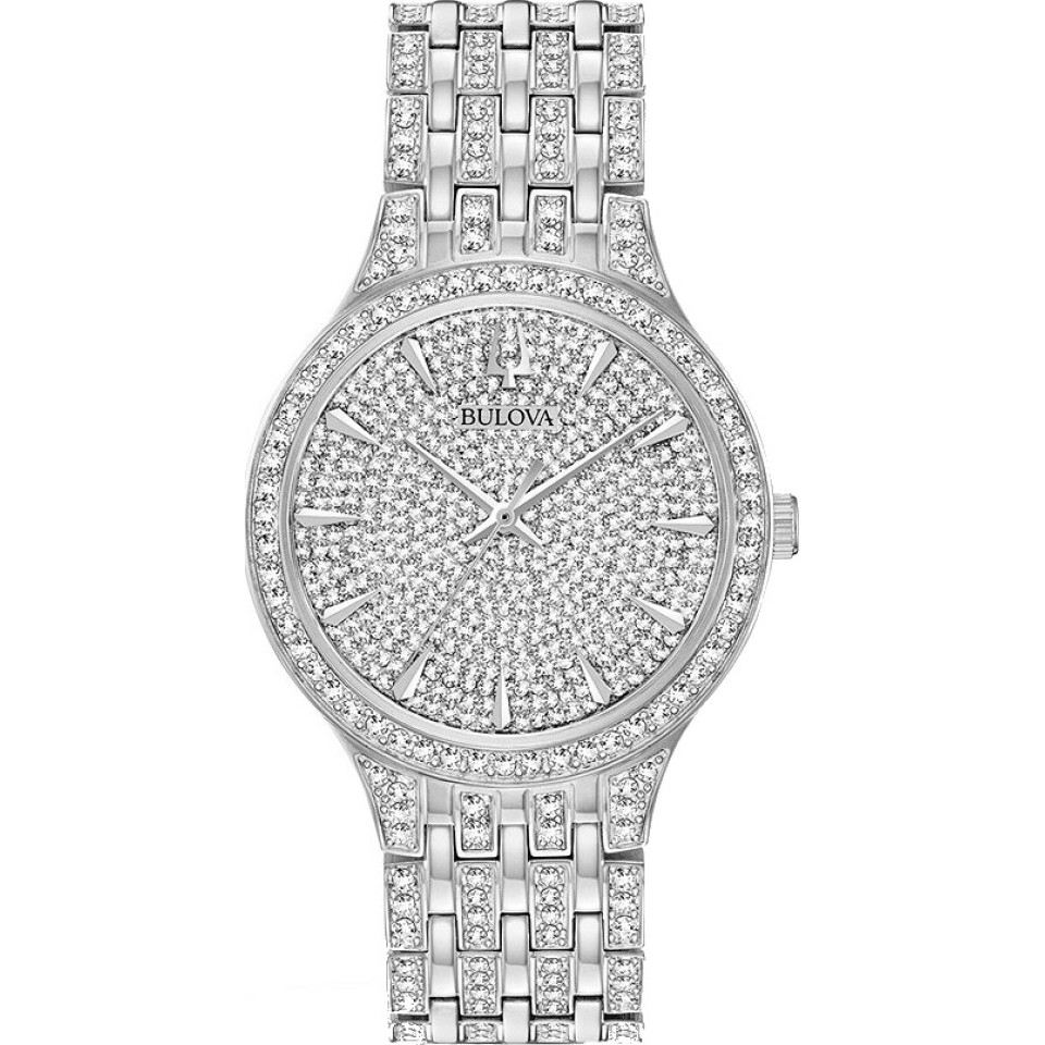 Những viên pha lê lấp lánh bao quanh mặt số xà cừ màu đen đầy mê hoặc của chiếc đồng hồ đeo tay trong bộ sưu tập Pha lê hai tông màu khó quên của Bulova.