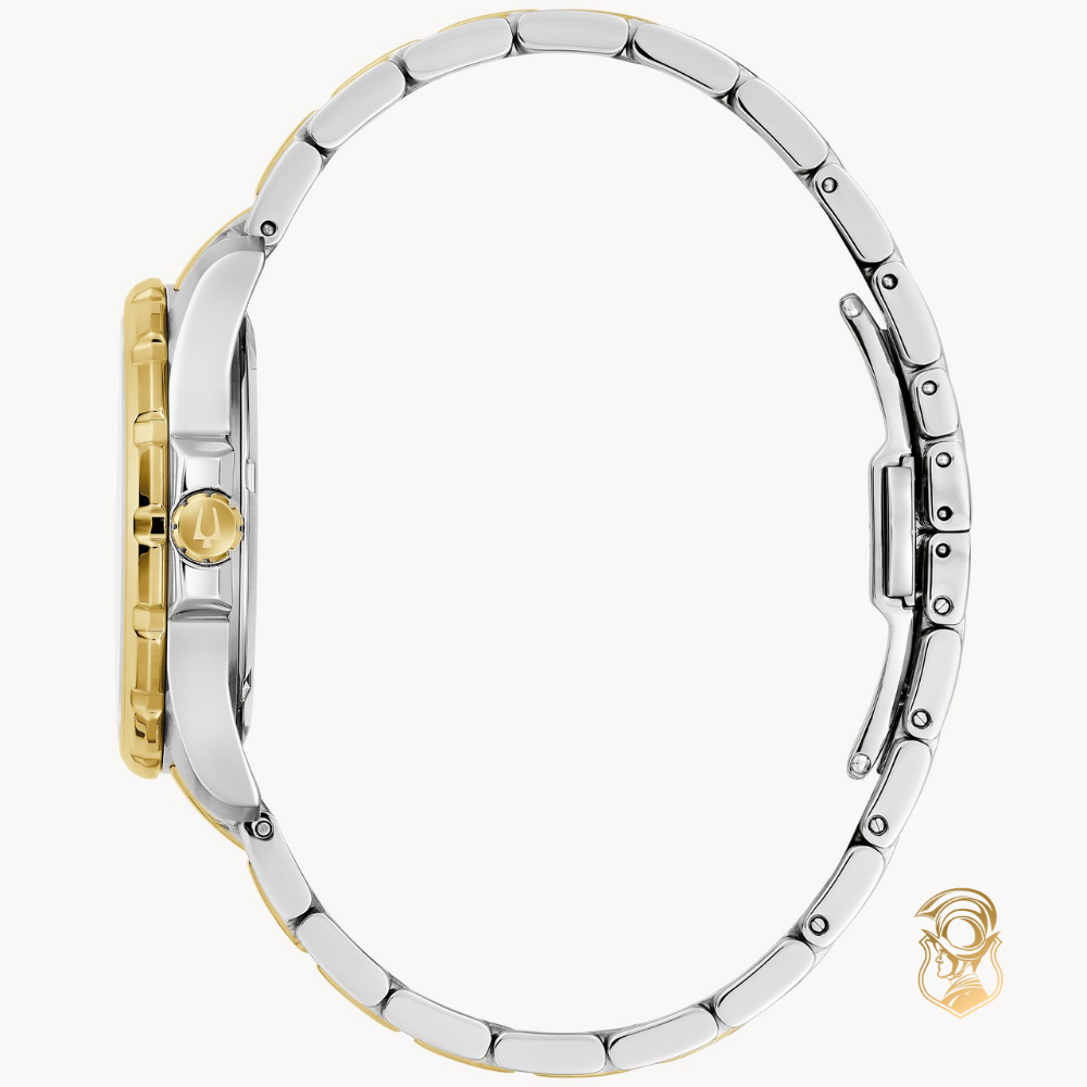 Từ bộ sưu tập Bulova Marine Star huyền thoại, chiếc đồng hồ nữ thể thao và thanh lịch này mang đến phong cách vô song. Vỏ thép không gỉ tông vàng và bạc có thiết kế hiện đại với vành bezel cố định hình răng cưa táo bạo và hai bên vỏ đối xứng. Mặt kính sapphire phẳng và núm điều chỉnh được bảo vệ mang đến độ tin cậy hiện đại, được tăng cường thêm khả năng chống nước ở độ sâu 100m. Mặt số xà cừ óng ánh tạo thêm nét quyến rũ cho chiếc đồng hồ, với tám vạch chỉ giờ kim cương và kim chỉ giờ tông vàng tinh tế với lớp phủ phát quang cho khả năng xem giờ tuyệt vời trong mọi điều kiện. Chiếc đồng hồ được kết hợp với dây đeo bằng thép không gỉ tháo lắp nhanh hai tông màu phù hợp với khóa bấm vừa thoải mái vừa an toàn. Để có được sự thanh lịch vượt thời gian trong bất kỳ dịp nào, chiếc đồng hồ nữ Bulova này là người bạn đồng hành hoàn hảo. *Màu sắc xà cừ trên mặt số có thể thay đổi do sự biến đổi tự nhiên của vật liệu. Phản xạ ánh sáng tạo ra hiệu ứng óng ánh, khiến màu sắc thay đổi và biến đổi, khiến mỗi mặt số trở nên độc đáo về màu sắc và tông màu. Bộ máy 2036 Quartz Bộ máy chạy bằng pin. Tinh thể thạch anh điều chỉnh thời gian đạt độ chính xác đến 15 giây một tháng. Mặt số tông vàng trắng điểm nhấn kim cương; Kim và vạch chỉ giờ phát sáng; Logo âm thoa. Vỏ 36mm thép không gỉ hai tông màu. Càng 18. Dây đeo bằng thép không gỉ Chốt gập có nút bấm. Pha lê Sapphire chống phản quang Chống va đập và vỡ – lớp phủ chống phản quang làm lệch hướng ánh sáng. Khả năng chống nước WR100/10Bar/333ft. Trọng lượng (g) 75. Chức năng bổ sung 3 kim