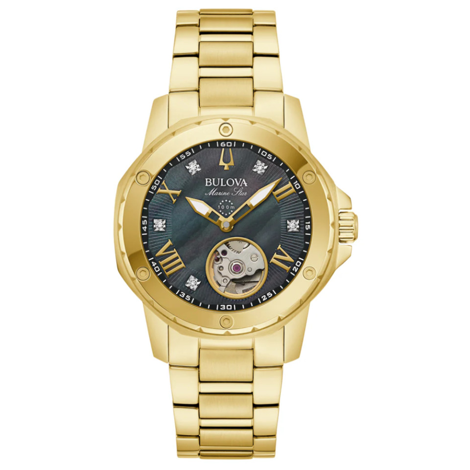 Vỏ và dây đeo bằng thép không gỉ tông vàng. Viền cố định tông vàng bằng thép không gỉ với bộ pha lê. Mặt số bằng vàng với kim có tông màu vàng và vạch chỉ giờ bằng pha lê. Loại quay số: Analog. Bộ máy Pin Bulova Calibre GL34. Tinh thể khoáng chống trầy xước. Vít xuống vương miện. Vỏ sau chắc chắn. Kiểu dáng vỏ tròn, kích thước vỏ: 40 mm. Chiều rộng dải: 20 mm. Gấp qua khóa bằng chốt an toàn. Chống nước ở độ sâu 30 mét / 100 feet. Chức năng: giờ, phút, giây. Dòng ma. Phong cách đồng hồ thể thao. Đồng hồ nam mặt số màu sâm panh pha lê Bulova Phantom 97A179.